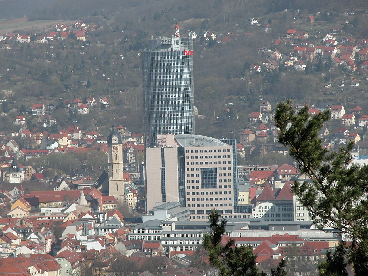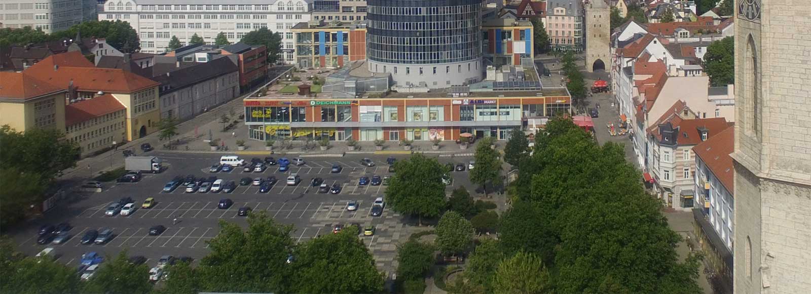 Die dann einsetzenden Planungen zu einem Justizzentrum am Sockel des Turmes werden nur bis ins Jahr 2000 verfolgt. Dann vergibt das Land den Zuschlag nicht für den Eichplatz sondern für das landeseigene Kasernengelände am Westbahnhof. Sallers ursprünglicher Plan für eine Einkaufspassage wird danach wieder aufgenommen und umgesetzt. BILD: Von Michael Köhler – https://thueringenfotos.de/, CC BY 4.0, https://commons.wikimedia.org/w/index.php?curid=107117720