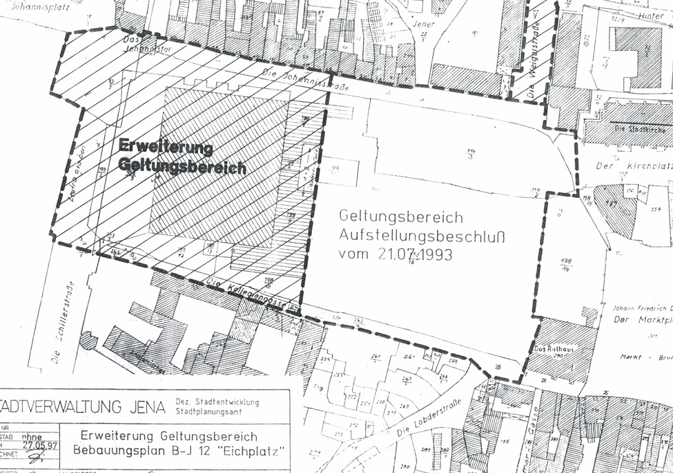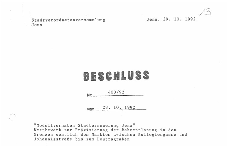 Im September 1996 stimmte der Stadtrat dem städtebaulichen Entwurf der Stadtverwaltung zu (Beschlussnr. 96/04/23/835). Grundlage war der Rahmenplan von 1993 zum Sanierungsgebiet „Modellvorhaben der Stadterneuerung Jena“. Mit dem Beschluss wurden zentrale Planverfahren bestätigt: die Überarbeitung des Siegerentwurfs des Wettbewerbs unter Einbeziehung der öffentlichen Belange und der Bürgerarbeitskreise, die Integration der Thesenpapiere sowie die geplante Bebauung von drei Baufeldern mit segmentierten Einzelbaukörpern.