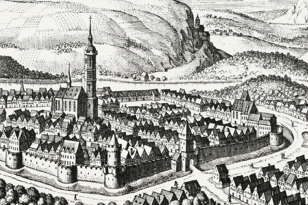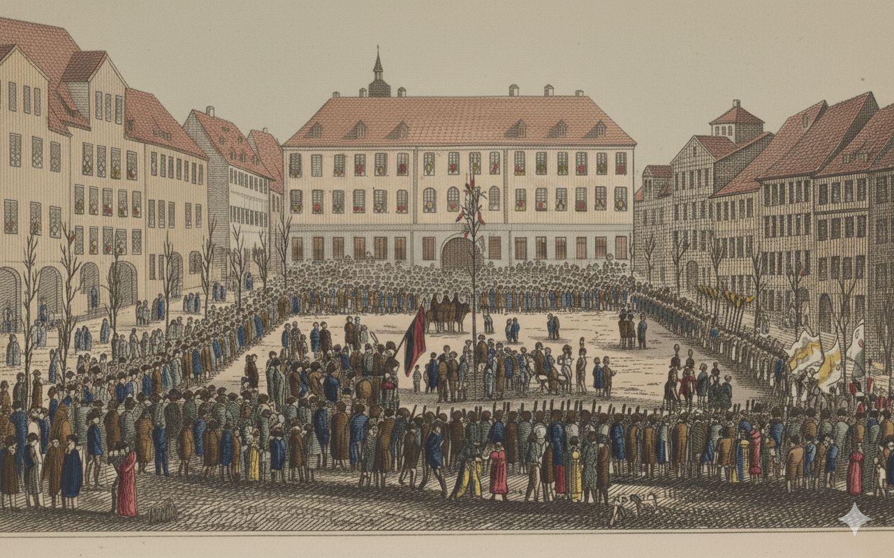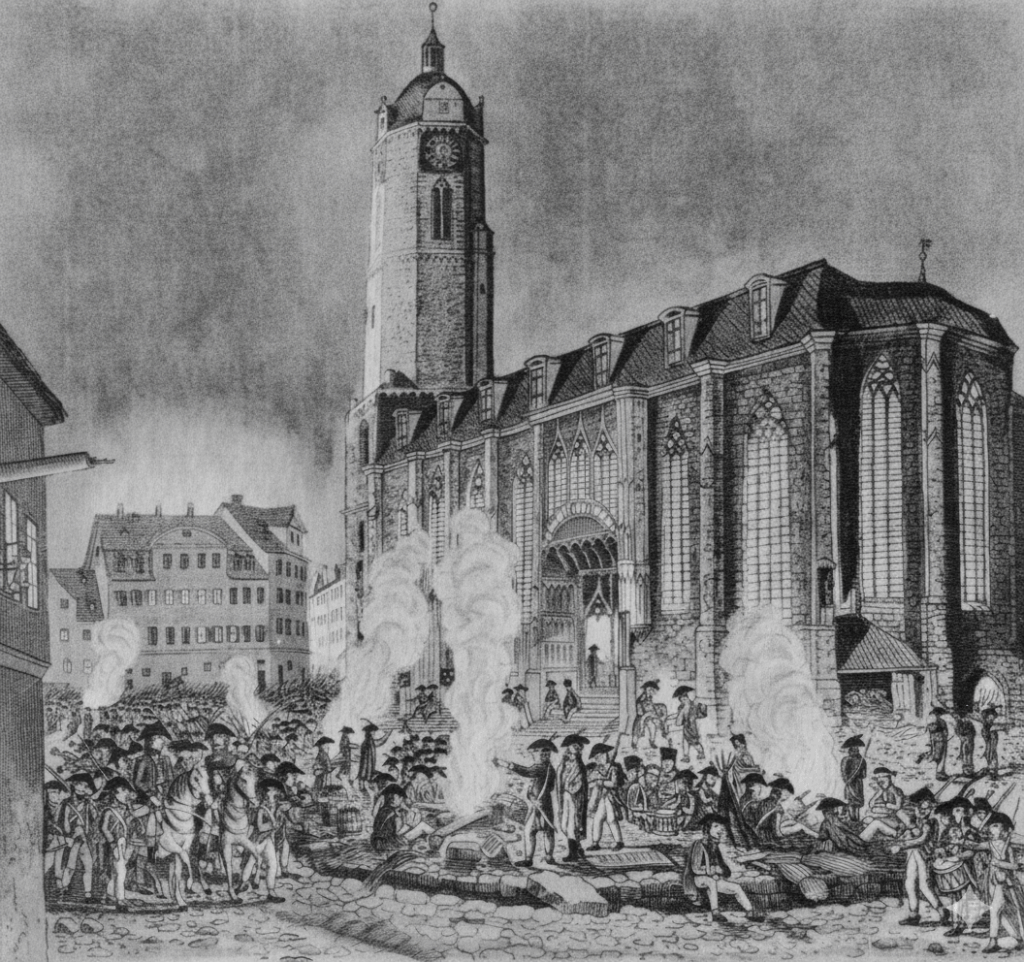 Französische Truppen ziehen durch Jena und lagern in der Stadt. Im Zuge dieses Chaos bricht im Bereich des späteren Eichplatzes ein Feuer aus und es brennen insgesamt 19 Häuser nieder. Der freie Bereich heißt daher auch lange Brandplatz. Später gibt es eine Ausgleichzahlung für die Schäden aus diesem Brand. Es werden aber dennoch nur wenige Häuser wieder aufgebaut. Bild: Jakob Wilhelm Christian Roux