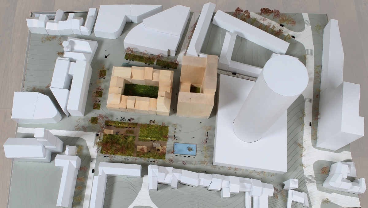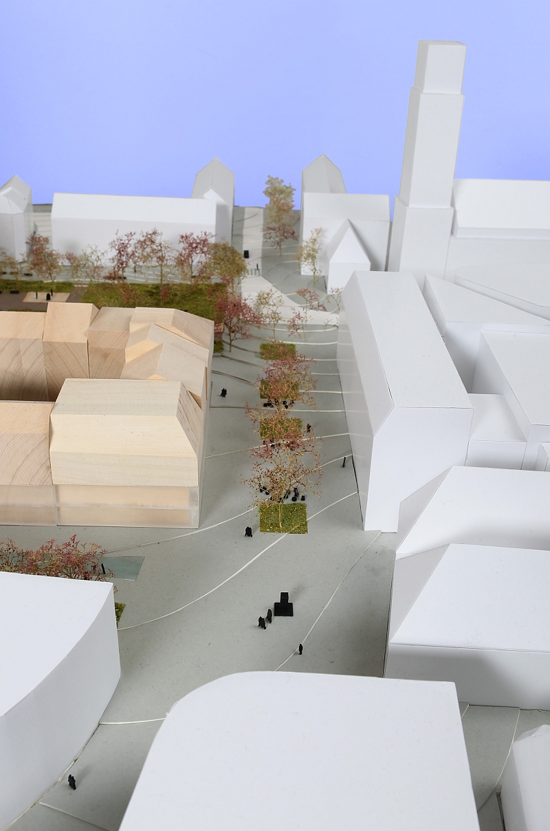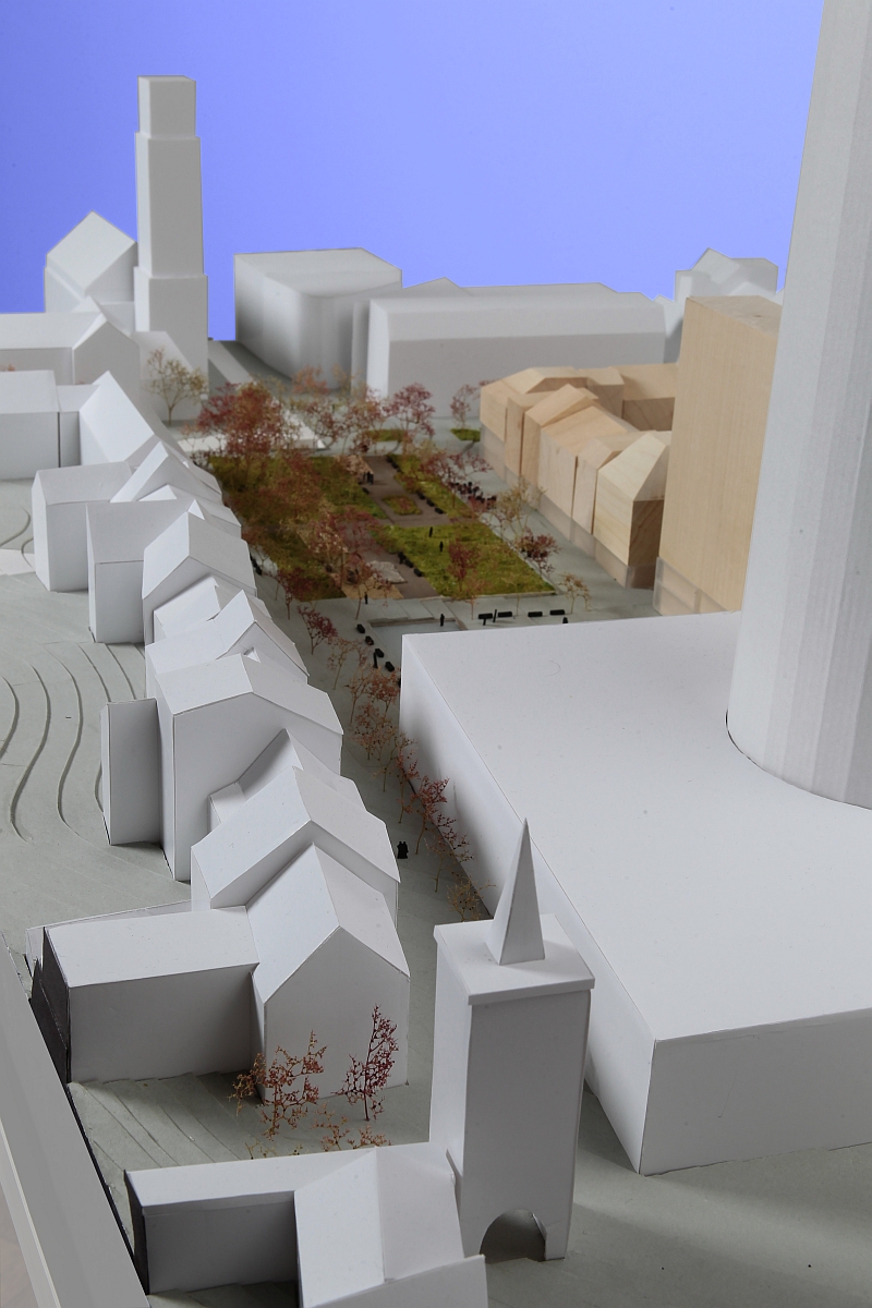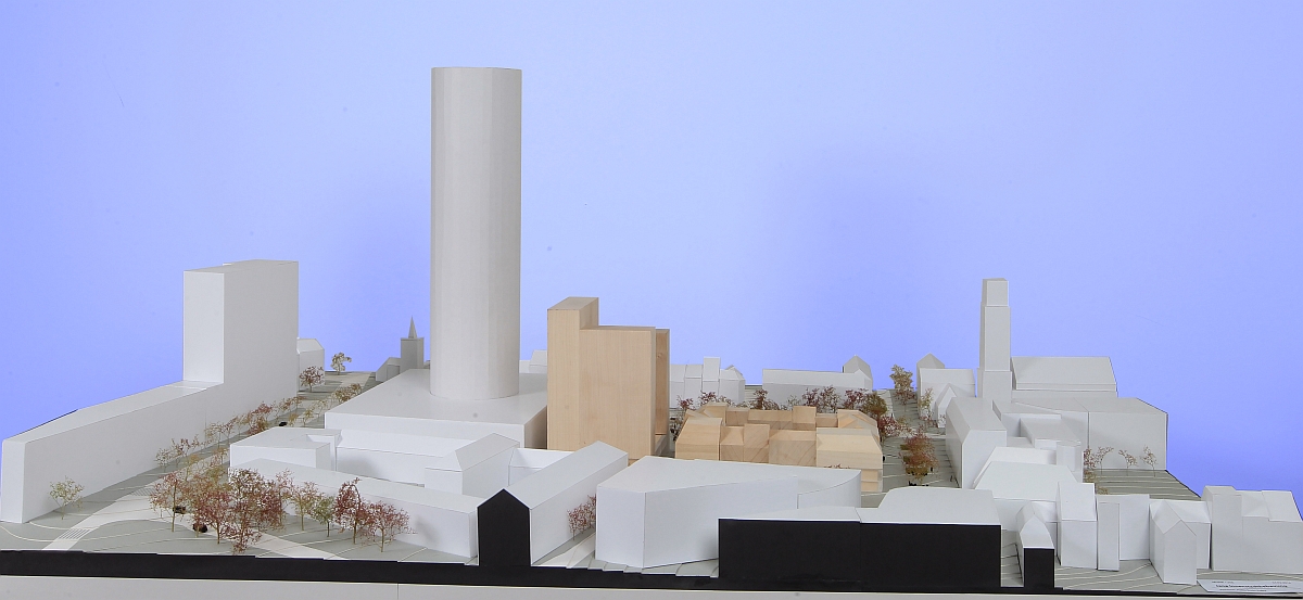 - Blick von Süden. Das Hochhaus mit zehn bis fünfzehn Stockwerken nimmt die Höhe des Bau 59 auf.