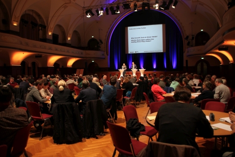 Am 30.10.2015 nahm die Eichplatzplanung im Volkshaus einen neuen Anlauf. „Nimm kein Blatt vor den Mund“ forderten die Plakate für die Veranstaltung. Mit Erfolg. Rund 160 Bürger waren der Einladung und Aufforderung gefolgt. Viele hatten sich schon früher in Sachen Eichplatz engagiert, aber es fanden sich auch neue Gesichter, unter anderem die 39 Bürger, die in zwei Werkstattrunden im November über die Zukunft des Platzes diskutieren sollen.